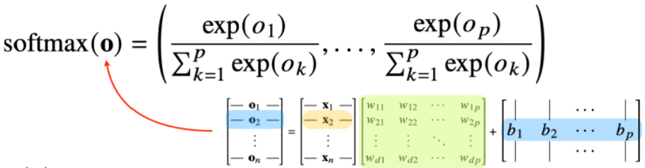 - softmax(o) = softmax(Wx +b)