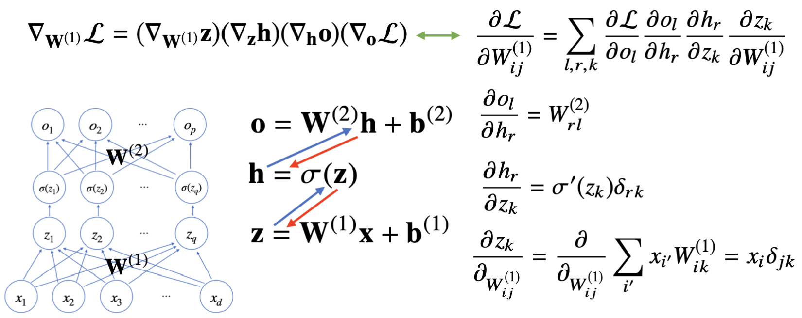์ด๋ ๊ฒ ๊ณ์ฐํ ๊ฐ๊ฐ์ ๊ฐ์ค์นํ๋ ฌ์ ๋ํ gradient vector๋ฅผ sgd๋ฅผ ์ด์ฉ, ๋ฐ์ดํฐ๋ฅผ mini-batch๋ก ๋ฒ๊ฐ์ ๊ฐ๋ฉฐ ํ์ต, ์ฃผ์ด์ง ๋ชฉ์ ์น๋ฅผ ์ต์ํํ๋.